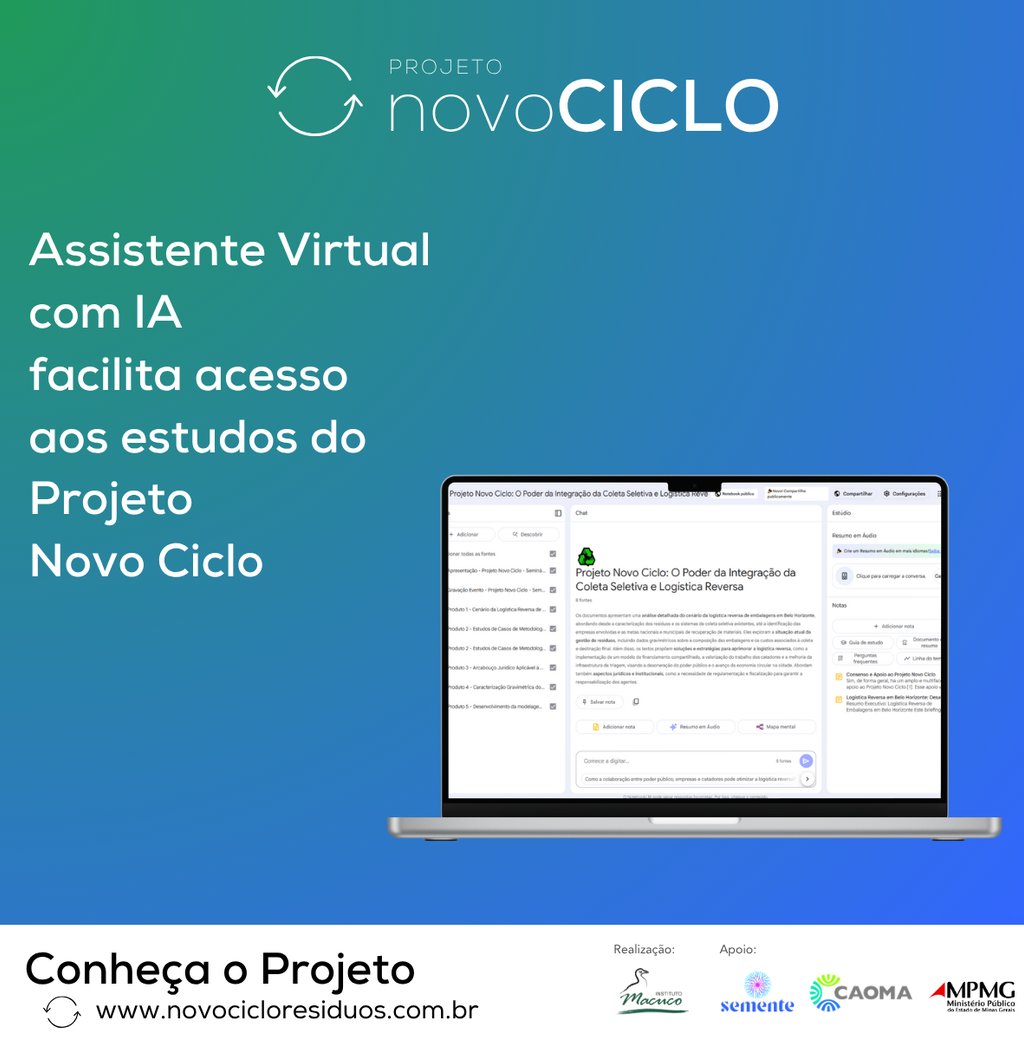Desenvolvemos um assistente virtual no NotebookLM, ferramenta de inteligência artificial do Google, totalmente alimentado com os estudos técnicos produzidos no âmbito do Projeto Novo Ciclo, além da gravação completa do evento de apresentação da 1ª Etapa. Essa iniciativa nasceu do compromisso contínuo do projeto em tornar o conhecimento técnico acessível, compreensível e disponível a todos que se interessem pelo tema.
