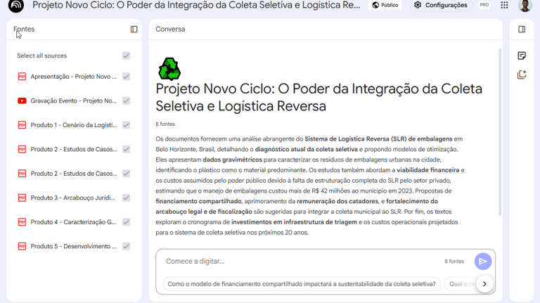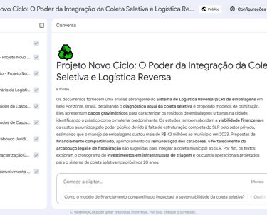 Assistente virtual desenvolvida no NotebookLM, ferramenta de inteligência artificial do Google, totalmente alimentado com os estudos técnicos produzidos no âmbito do Projeto Novo Ciclo, além da gravação completa do evento de apresentação da 1ª Etapa. A ferramenta permite que qualquer pessoa possa interagir diretamente com toda a base documental do projeto, realizando perguntas em linguagem natural e obtendo respostas precisas e contextualizada.